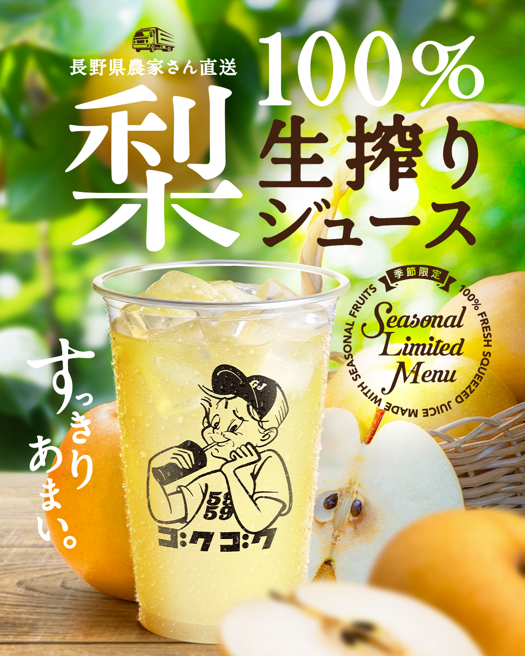 長野県の契約農家から直送される、みずみずしい梨を贅沢に使った100%生搾りジュースです。新鮮な果実ならではの豊かな果汁感とすっきりとした甘さが魅力。季節とともに販売するジュースの品種が変わり、爽やかな甘みと酸味のバランスが心地よい「豊水」から、濃厚でコクのある甘さが特徴の「南水」へ。品種ごとの違いを飲み比べながら、旬ならではの味わいをお楽しみください。
